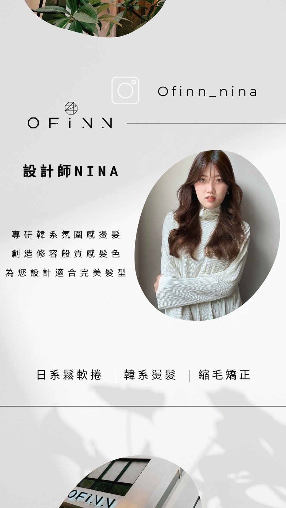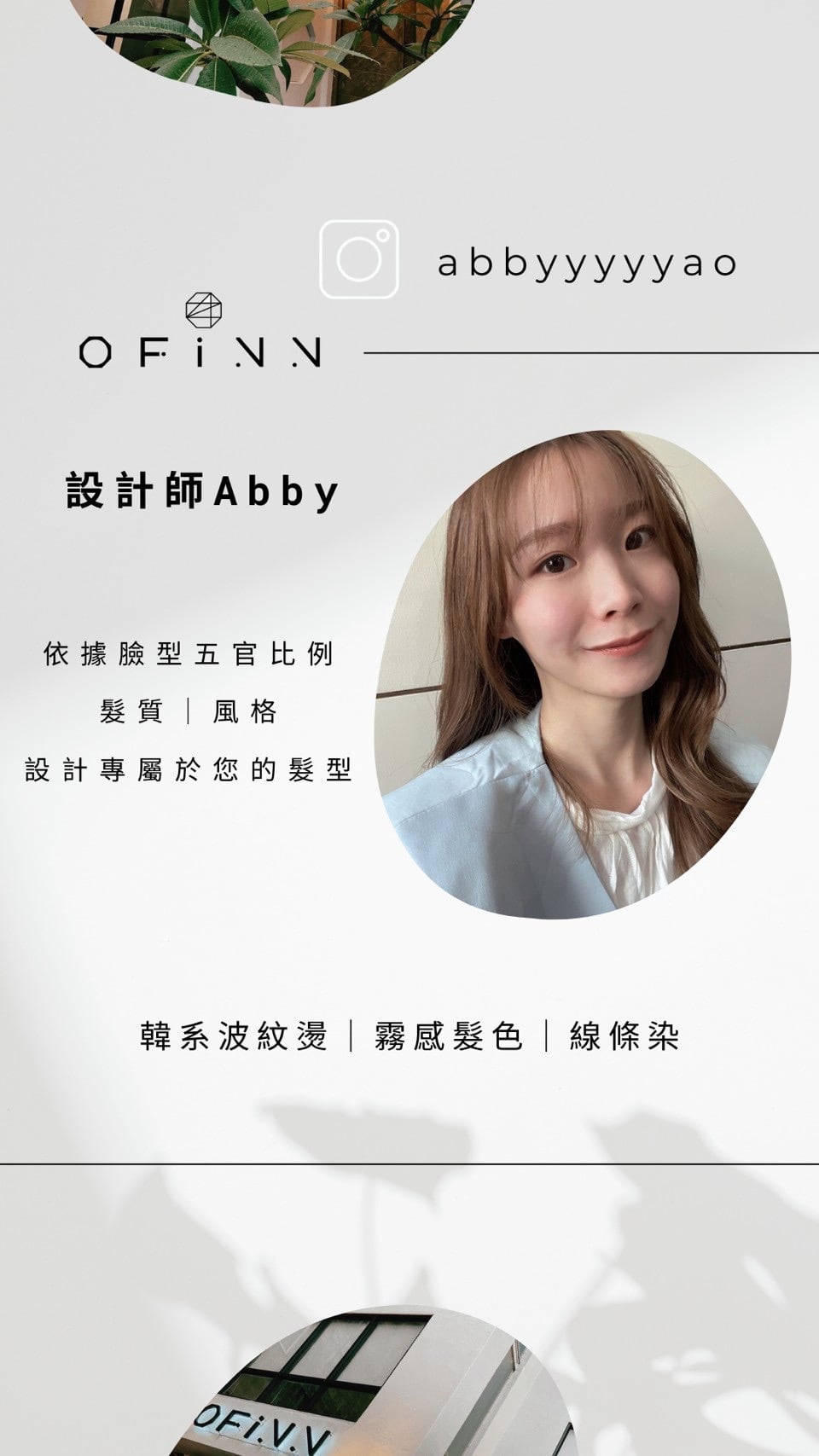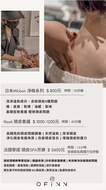 關於Ofinn Ofinn彰化美業第一品牌 2007年4月12日創立品牌開始 從2人小型個人工作室開始,為了實現成為彰化指標美業店家這個目標,努力了好幾年也盼了很久,直到發展到現在,在2021年我們Offinn終於成為彰化當地最大的美業品牌 擁有百坪以上的舒適空間。並備有汽、機車專屬停車場。品牌旗下更有20位專業團隊,技術營業項目服務:髮型設計、頭皮理療SPA、美甲、美睫、睫毛捲翹角蛋白、霧眉、彩妝教學、新娘秘書、會議室展覽空間出租。多項服務只要來一趟就可為你從頭到腳量身打造個人魅力形象。 Ofinn一直有個願景打造彰化在地美業品牌,讓喜愛美業行業的人可以在自己的家鄉打拼,發揮自己的能力讓彰化在地人知道,彰化在地有很多優秀的美髮設計師人才是值得讓你們信任的。 Ofinn的經營設計理念: 不斷定期進修學習最流行的設計元素及最新的髮品資訊,並透過專業設計理論為基礎應用於現場。 Ofinn 的設計理念: 不一昧追求流行,而是在最適合顧客的髮型中帶入流行元素,才能真正滿足顧客需求及訂製適合性髮型。